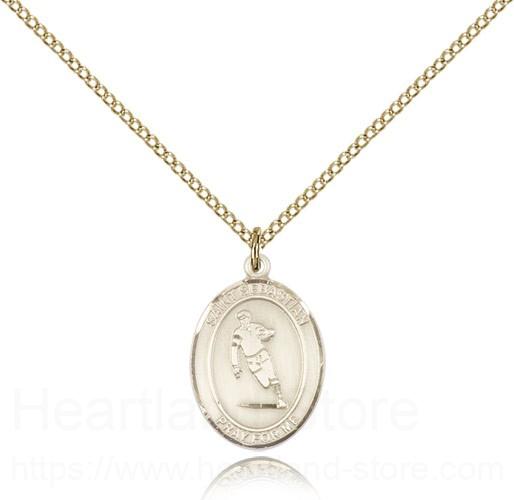 St. Sebastian Rugby Medal This St. Sebastian Rugby Pendant is made of gold filled and is approximately the size of a nickel. The jewelry pendant is paired with an 18 inch gold filled light curb chain as pictured. All medals are gift boxed in a beautiful blue velvet hinged jewelry gift box.