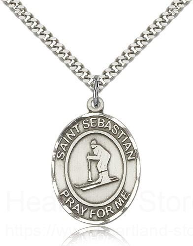 This St. Sebastian Skiing Pendant is made of sterling silver and is approximately the size of a quarter. The jewelry pendant is paired with a 24 inch stainless steel heavy curb chain as pictured. All medals are gift boxed in a beautiful blue velvet hinged jewelry gift box.