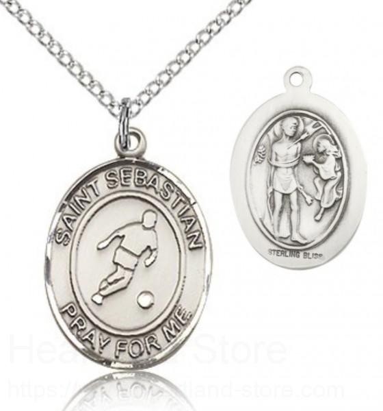 St. Sebastian Soccer Medal This St. Sebastian Soccer Pendant is made of sterling silver and is approximately the size of a nickel. The jewelry pendant is paired with an 18 inch sterling silver light curb chain as pictured. All medals are gift boxed in a beautiful blue velvet hinged jewelry gift box.