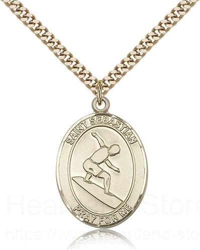 This St. Sebastian Surfing Pendant is made of gold filled and is approximately the size of a quarter. The jewelry pendant is paired with a 24 inch gold filled heavy curb chain as pictured. All medals are gift boxed in a beautiful blue velvet hinged jewelry gift box.