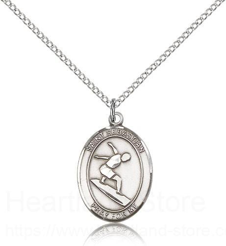 This St. Sebastian Surfing Pendant is made of sterling silver and is approximately the size of a nickel. The jewelry pendant is paired with an 18 inch sterling silver light curb chain as pictured. All medals are gift boxed in a beautiful blue velvet hinged jewelry gift box.