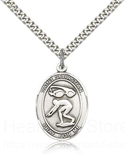 This St. Sebastian Swimming Pendant is made of sterling silver and is approximately the size of a quarter. The jewelry pendant is paired with a 24 inch stainless steel heavy curb chain as pictured. All medals are gift boxed in a beautiful blue velvet hinged jewelry gift box.