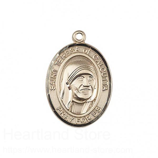 St. Teresa of Calcutta Medal This St. Teresa of Calcutta Pendant is made of 14 Karat Gold and is approximately the size of a nickel. The jewelry pendant is sold individually and does not come with a chain. All medals are gift boxed in a beautiful blue velvet hinged jewelry gift box.