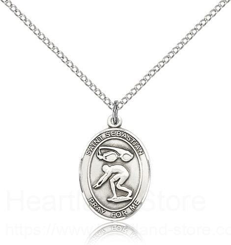 This St. Sebastian Swimming Pendant is made of sterling silver and is approximately the size of a nickel. The jewelry pendant is paired with an 18 inch sterling silver light curb chain as pictured. All medals are gift boxed in a beautiful blue velvet hinged jewelry gift box.
