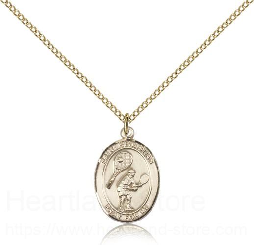 This St. Sebastian Tennis Pendant is made of gold filled and is approximately the size of a nickel. The jewelry pendant is paired with an 18 inch gold filled light curb chain as pictured. All medals are gift boxed in a beautiful blue velvet hinged jewelry gift box.
