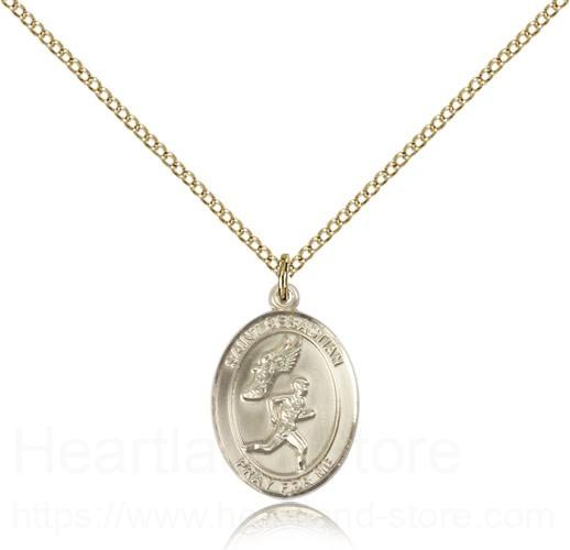 This St. Sebastian Track and Field Pendant is made of gold filled and is approximately the size of a nickel. The jewelry pendant is paired with an 18 inch gold filled light curb chain as pictured. All medals are gift boxed in a beautiful blue velvet hinged jewelry gift box.