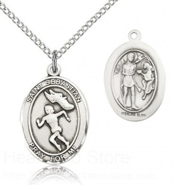This St. Sebastian Track and Field Pendant is made of sterling silver and is approximately the size of a nickel. The jewelry pendant is paired with an 18 inch sterling silver light curb chain as pictured. All medals are gift boxed in a beautiful blue velvet hinged jewelry gift box.