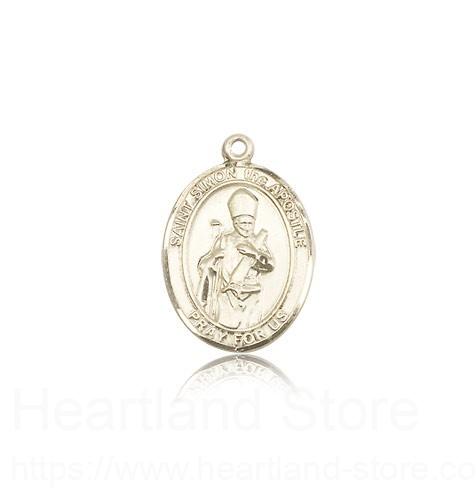This St. Simon Pendant is made of 14 Karat Gold and is approximately the size of a nickel. The jewelry pendant is sold individually and does not come with a chain. All medals are gift boxed in a beautiful blue velvet hinged jewelry gift box.
