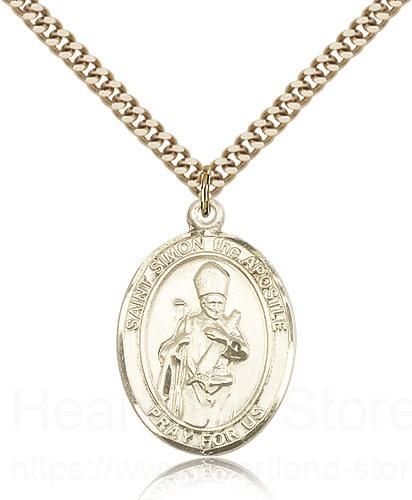 This St. Simon Pendant is made of gold filled and is approximately the size of a quarter. The jewelry pendant is paired with a 24 inch gold filled heavy curb chain as pictured. All medals are gift boxed in a beautiful blue velvet hinged jewelry gift box.