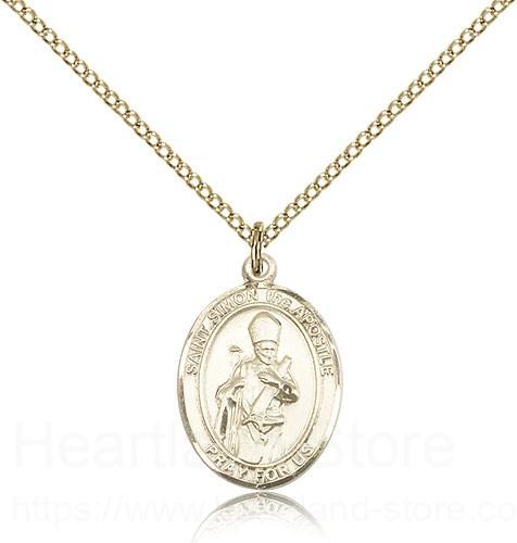 This St. Simon Pendant is made of gold filled and is approximately the size of a nickel. The jewelry pendant is paired with an 18 inch gold filled light curb chain as pictured. All medals are gift boxed in a beautiful blue velvet hinged jewelry gift box.