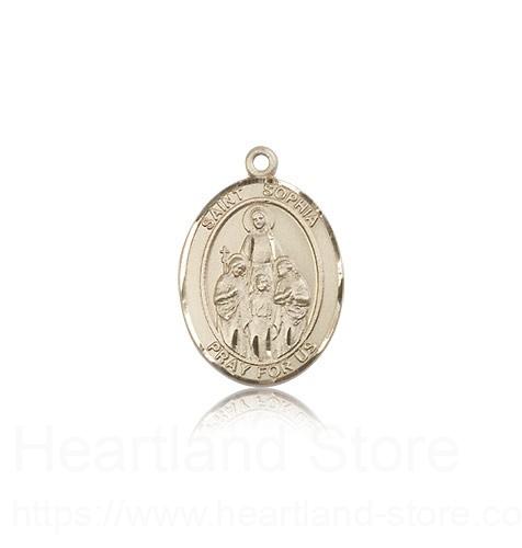 This St. Sophia Pendant is made of 14 Karat Gold and is approximately the size of a nickel. The jewelry pendant is sold individually and does not come with a chain. All medals are gift boxed in a beautiful blue velvet hinged jewelry gift box.