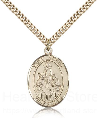 This St. Sophia Pendant is made of gold filled and is approximately the size of a quarter. The jewelry pendant is paired with a 24 inch gold filled heavy curb chain as pictured. All medals are gift boxed in a beautiful blue velvet hinged jewelry gift box.