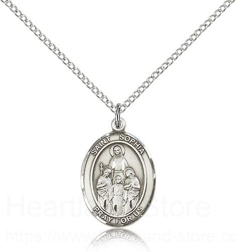 This St. Sophia Pendant is made of sterling silver and is approximately the size of a nickel. The jewelry pendant is paired with an 18 inch sterling silver light curb chain as pictured. All medals are gift boxed in a beautiful blue velvet hinged jewelry gift box.