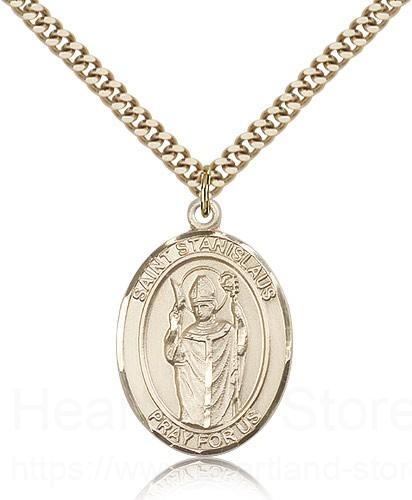 This St. Stanislaus Pendant is made of gold filled and is approximately the size of a quarter. The jewelry pendant is paired with a 24 inch gold filled heavy curb chain as pictured. All medals are gift boxed in a beautiful blue velvet hinged jewelry gift box.
