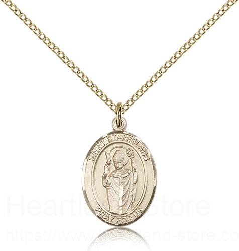 This St. Stanislaus Pendant is made of gold filled and is approximately the size of a nickel. The jewelry pendant is paired with an 18 inch gold filled light curb chain as pictured. All medals are gift boxed in a beautiful blue velvet hinged jewelry gift box.