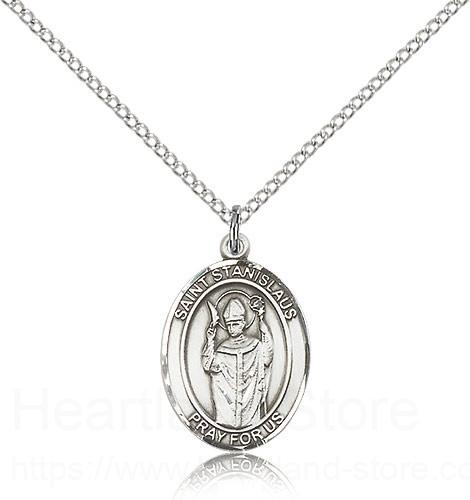 This St. Stanislaus Pendant is made of sterling silver and is approximately the size of a nickel. The jewelry pendant is paired with an 18 inch sterling silver light curb chain as pictured. All medals are gift boxed in a beautiful blue velvet hinged jewelry gift box.