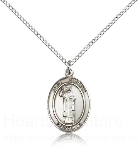 This St. Stephen the Martyr Pendant is made of sterling silver and is approximately the size of a nickel. The jewelry pendant is paired with an 18 inch sterling silver light curb chain as pictured. All medals are gift boxed in a beautiful blue velvet hinged jewelry gift box.