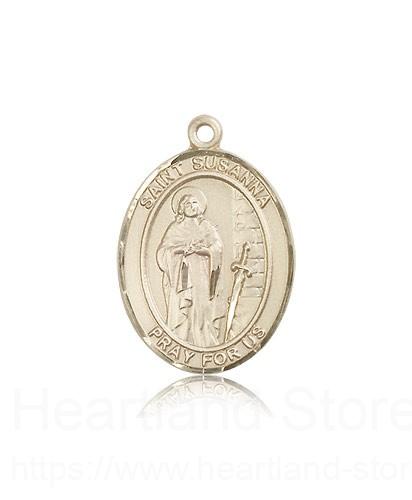 This St. Susanna Pendant is made of 14 Karat Gold and is approximately the size of a quarter. The jewelry pendant is sold individually and does not come with a chain. All medals are gift boxed in a beautiful blue velvet hinged jewelry gift box.