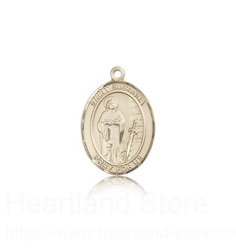 This St. Susanna Pendant is made of 14 Karat Gold and is approximately the size of a nickel. The jewelry pendant is sold individually and does not come with a chain. All medals are gift boxed in a beautiful blue velvet hinged jewelry gift box.