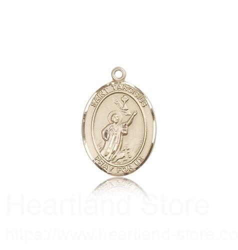 This St. Tarcisius Pendant is made of 14 Karat Gold and is approximately the size of a nickel. The jewelry pendant is sold individually and does not come with a chain. All medals are gift boxed in a beautiful blue velvet hinged jewelry gift box.