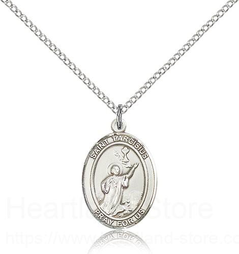 This St. Tarcisius Pendant is made of sterling silver and is approximately the size of a nickel. The jewelry pendant is paired with an 18 inch sterling silver light curb chain as pictured. All medals are gift boxed in a beautiful blue velvet hinged jewelry gift box.