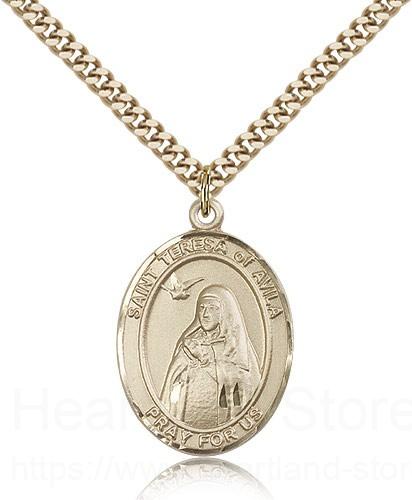 This St. Teresa of Avila Pendant is made of gold filled and is approximately the size of a quarter. The jewelry pendant is paired with a 24 inch gold filled heavy curb chain as pictured. All medals are gift boxed in a beautiful blue velvet hinged jewelry gift box.