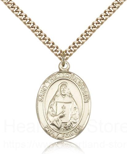This St. Theodore Guerin Pendant is made of gold filled and is approximately the size of a quarter. The jewelry pendant is paired with a 24 inch gold filled heavy curb chain as pictured. All medals are gift boxed in a beautiful blue velvet hinged jewelry gift box.