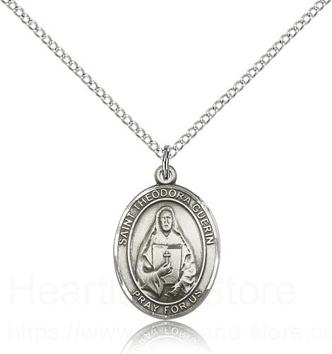 This St. Theodore Guerin Pendant is made of sterling silver and is approximately the size of a nickel. The jewelry pendant is paired with an 18 inch sterling silver light curb chain as pictured. All medals are gift boxed in a beautiful blue velvet hinged jewelry gift box.