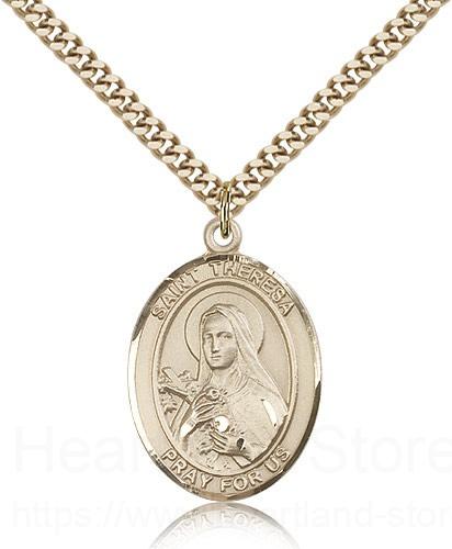 This St. Theresa Pendant is made of gold filled and is approximately the size of a quarter. The jewelry pendant is paired with a 24 inch gold filled heavy curb chain as pictured. All medals are gift boxed in a beautiful blue velvet hinged jewelry gift box.