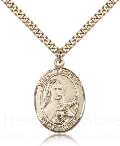 This St. Therese of Lisieux Pendant is made of gold filled and is approximately the size of a quarter. The jewelry pendant is paired with a 24 inch gold filled heavy curb chain as pictured. All medals are gift boxed in a beautiful blue velvet hinged jewelry gift box.
