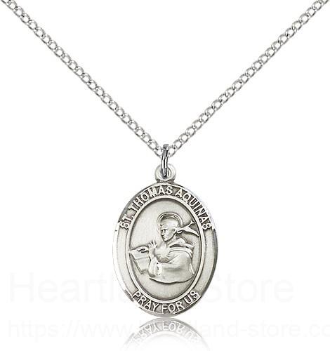 St. Thomas Aquinas Medal This St. Thomas Aquinas Pendant is made of sterling silver and is approximately the size of a nickel. The jewelry pendant is paired with an 18 inch sterling silver light curb chain as pictured. All medals are gift boxed in a beautiful blue velvet hinged jewelry gift box.