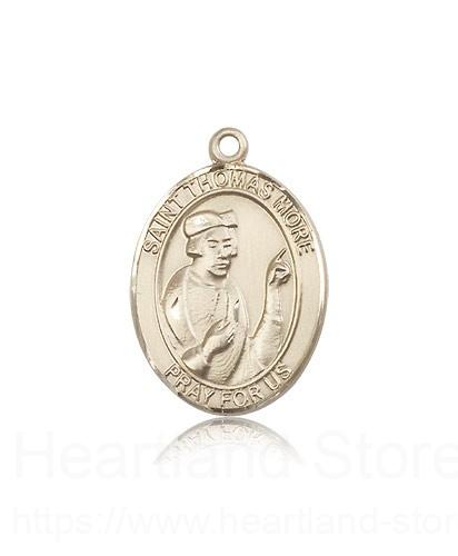 St. Thomas More Medal This St. Thomas More Pendant is made of 14 Karat Gold and is approximately the size of a quarter. The jewelry pendant is sold individually and does not come with a chain. All medals are gift boxed in a beautiful blue velvet hinged jewelry gift box.