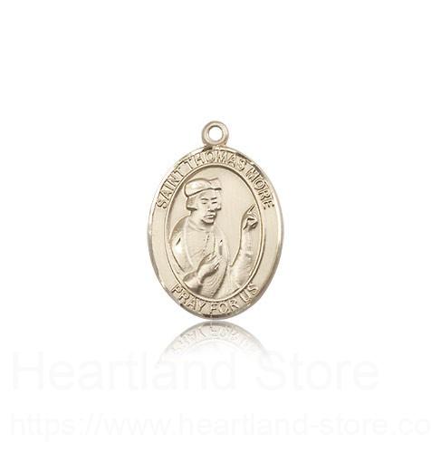 St. Thomas More Medal This St. Thomas More Pendant is made of 14 Karat Gold and is approximately the size of a nickel. The jewelry pendant is sold individually and does not come with a chain. All medals are gift boxed in a beautiful blue velvet hinged jewelry gift box.