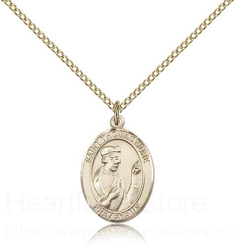 St. Thomas More Medal This St. Thomas More Pendant is made of gold filled and is approximately the size of a nickel. The jewelry pendant is paired with an 18 inch gold filled light curb chain as pictured. All medals are gift boxed in a beautiful blue velvet hinged jewelry gift box.