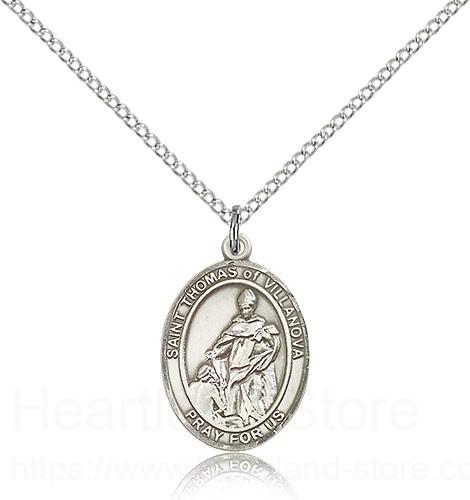 St. Thomas of Villanova Medal This St. Thomas of Villanova Pendant is made of sterling silver and is approximately the size of a nickel. The jewelry pendant is paired with an 18 inch sterling silver light curb chain as pictured. All medals are gift boxed in a beautiful blue velvet hinged jewelry gift box.