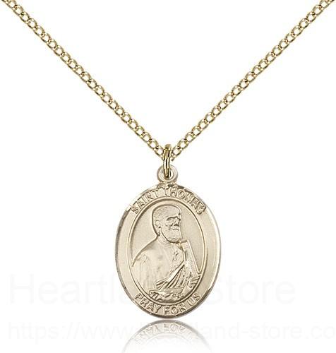 St. Thomas the Apostle Medal This St. Thomas the Apostle Pendant is made of gold filled and is approximately the size of a nickel. The jewelry pendant is paired with an 18 inch gold filled light curb chain as pictured. All medals are gift boxed in a beautiful blue velvet hinged jewelry gift box.