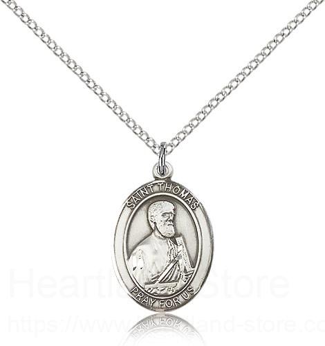St. Thomas the Apostle Medal This St. Thomas the Apostle Pendant is made of sterling silver and is approximately the size of a nickel. The jewelry pendant is paired with an 18 inch sterling silver light curb chain as pictured. All medals are gift boxed in a beautiful blue velvet hinged jewelry gift box.