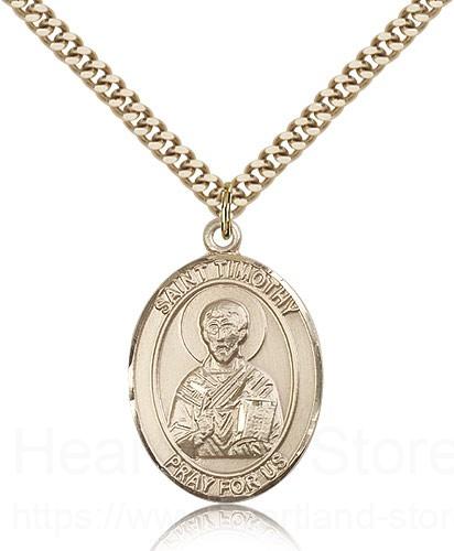 This St. Timothy Pendant is made of gold filled and is approximately the size of a quarter. The jewelry pendant is paired with a 24 inch gold filled heavy curb chain as pictured. All medals are gift boxed in a beautiful blue velvet hinged jewelry gift box.