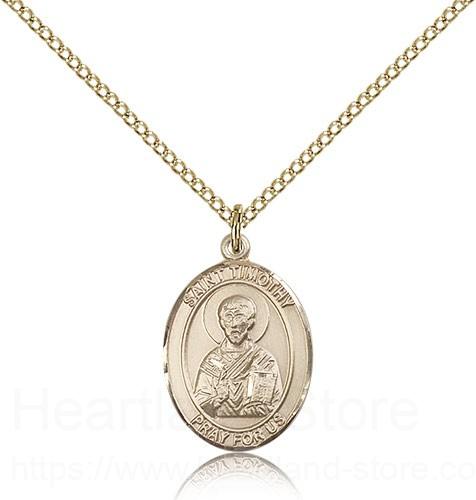 This St. Timothy Pendant is made of gold filled and is approximately the size of a nickel. The jewelry pendant is paired with an 18 inch gold filled light curb chain as pictured. All medals are gift boxed in a beautiful blue velvet hinged jewelry gift box.