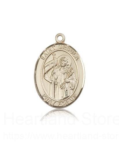 This St. Ursula Pendant is made of 14 Karat Gold and is approximately the size of a quarter. The jewelry pendant is sold individually and does not come with a chain. All medals are gift boxed in a beautiful blue velvet hinged jewelry gift box.
