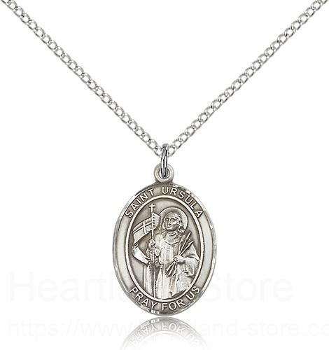 This St. Ursula Pendant is made of sterling silver and is approximately the size of a nickel. The jewelry pendant is paired with an 18 inch sterling silver light curb chain as pictured. All medals are gift boxed in a beautiful blue velvet hinged jewelry gift box.