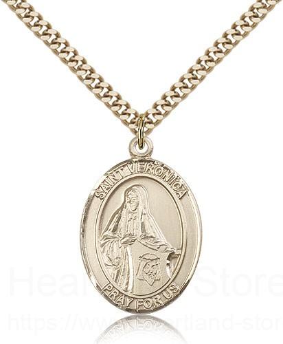 This St. Veronica Pendant is made of gold filled and is approximately the size of a quarter. The jewelry pendant is paired with a 24 inch gold filled heavy curb chain as pictured. All medals are gift boxed in a beautiful blue velvet hinged jewelry gift box.