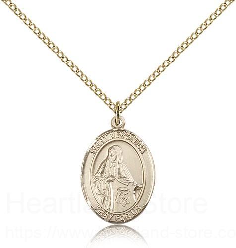 This St. Veronica Pendant is made of gold filled and is approximately the size of a nickel. The jewelry pendant is paired with an 18 inch gold filled light curb chain as pictured. All medals are gift boxed in a beautiful blue velvet hinged jewelry gift box.
