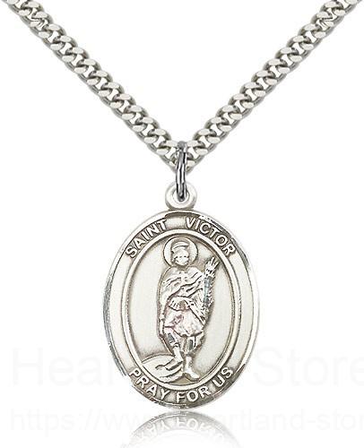 This St. Victor of Marseilles Pendant is made of sterling silver and is approximately the size of a quarter. The jewelry pendant is paired with a 24 inch stainless steel heavy curb chain as pictured. All medals are gift boxed in a beautiful blue velvet hinged jewelry gift box.