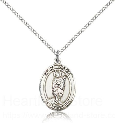 This St. Victor of Marseilles Pendant is made of sterling silver and is approximately the size of a nickel. The jewelry pendant is paired with an 18 inch sterling silver light curb chain as pictured. All medals are gift boxed in a beautiful blue velvet hinged jewelry gift box.