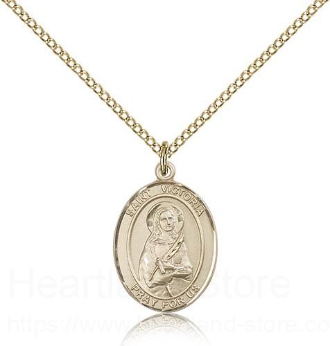 St. Victoria Medal This St. Victoria Pendant is made of gold filled and is approximately the size of a nickel. The jewelry pendant is paired with an 18 inch gold filled light curb chain as pictured. All medals are gift boxed in a beautiful blue velvet hinged jewelry gift box.