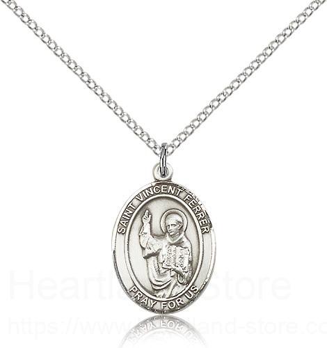 This St. Vincent Ferrer Pendant is made of sterling silver and is approximately the size of a nickel. The jewelry pendant is paired with an 18 inch sterling silver light curb chain as pictured. All medals are gift boxed in a beautiful blue velvet hinged jewelry gift box.