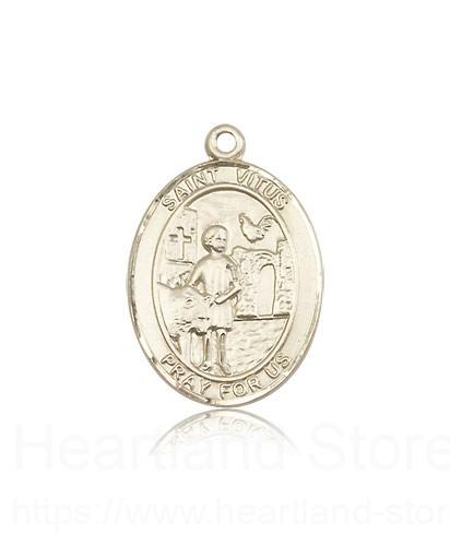 This St. Vitus Pendant is made of 14 Karat Gold and is approximately the size of a quarter. The jewelry pendant is sold individually and does not come with a chain. All medals are gift boxed in a beautiful blue velvet hinged jewelry gift box.