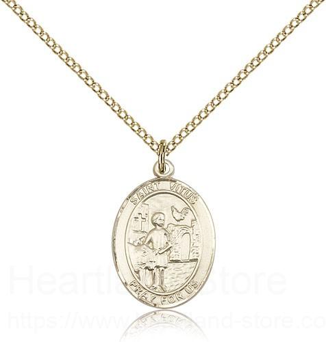 This St. Vitus Pendant is made of gold filled and is approximately the size of a nickel. The jewelry pendant is paired with an 18 inch gold filled light curb chain as pictured. All medals are gift boxed in a beautiful blue velvet hinged jewelry gift box.