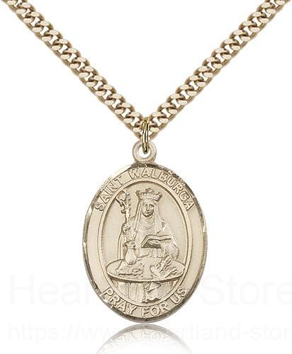 This St. Walburga Pendant is made of gold filled and is approximately the size of a quarter. The jewelry pendant is paired with a 24 inch gold filled heavy curb chain as pictured. All medals are gift boxed in a beautiful blue velvet hinged jewelry gift box.